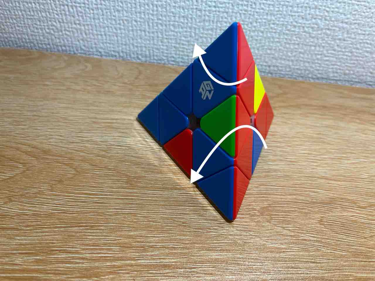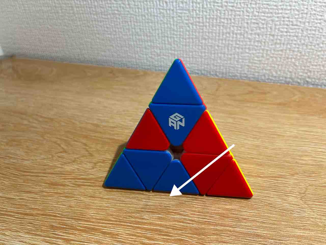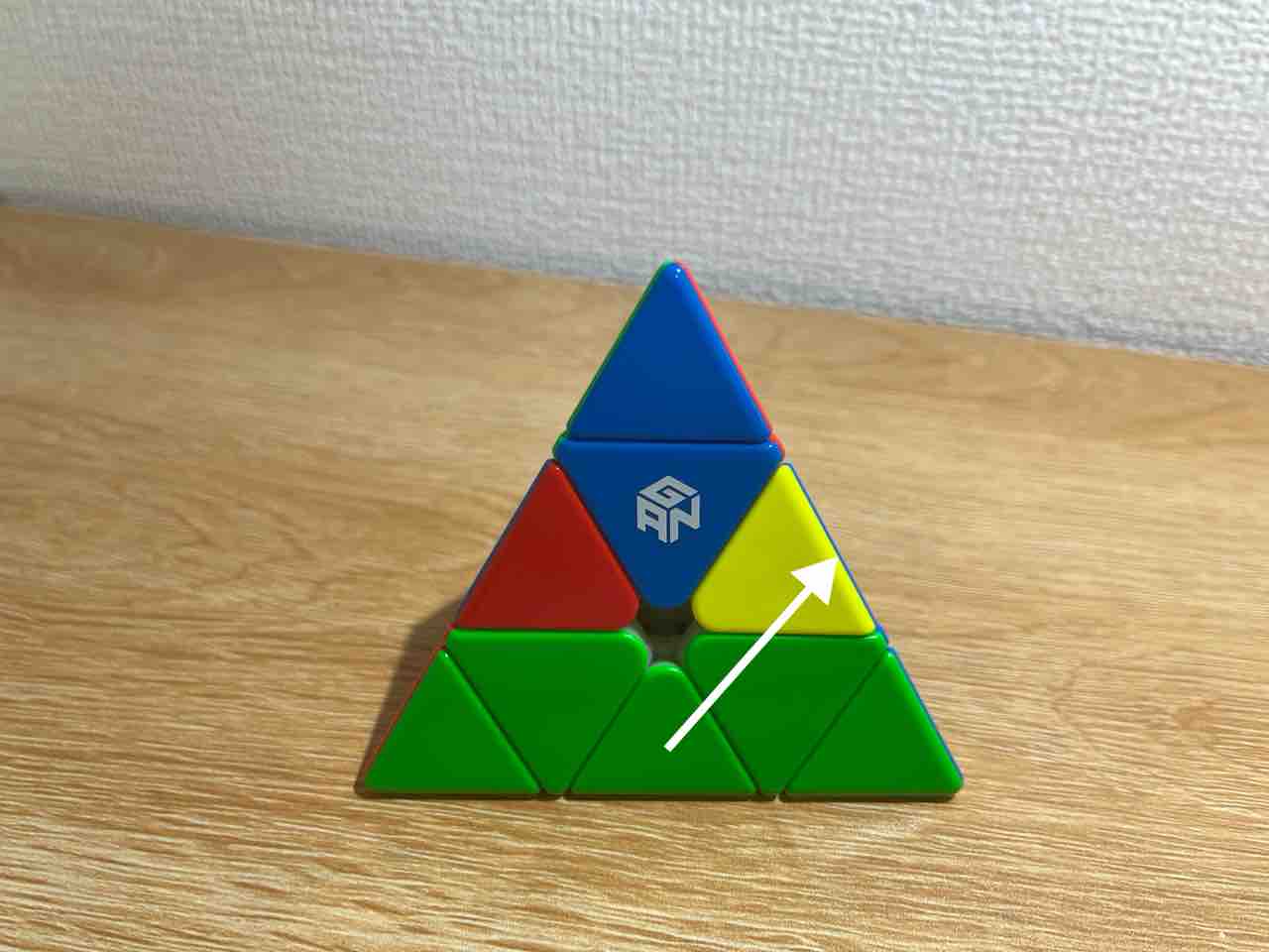 今回は揃えたい色が黄色で右中段に配置した時に黄色が正面になるのでこのように持ちます。