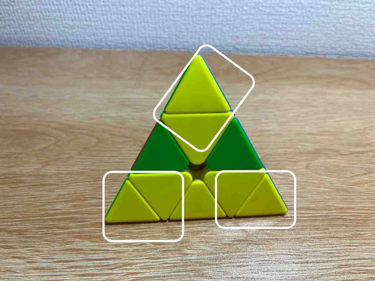 既に菱形の色は揃えているはずなので、残り揃えるのはこの3つになります(場合によってはもっと少ないかもしれません。)。